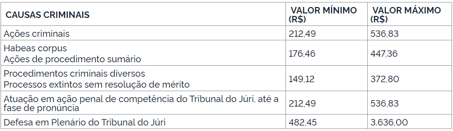O Conselho da Justiça Federal (CJF) atualizou a tabela dos honorários, em causas criminais, dos advogados dativos e dos curadores na Justiça Federal Comum. De acordo com a Resolução 775-CJF/2022, foram incluídos valores próprios para a atuação em ação penal de competência do Tribunal do Júri, até a pronúncia, e para a defesa em plenário do referido Tribunal, na parte que trata das causas criminais.